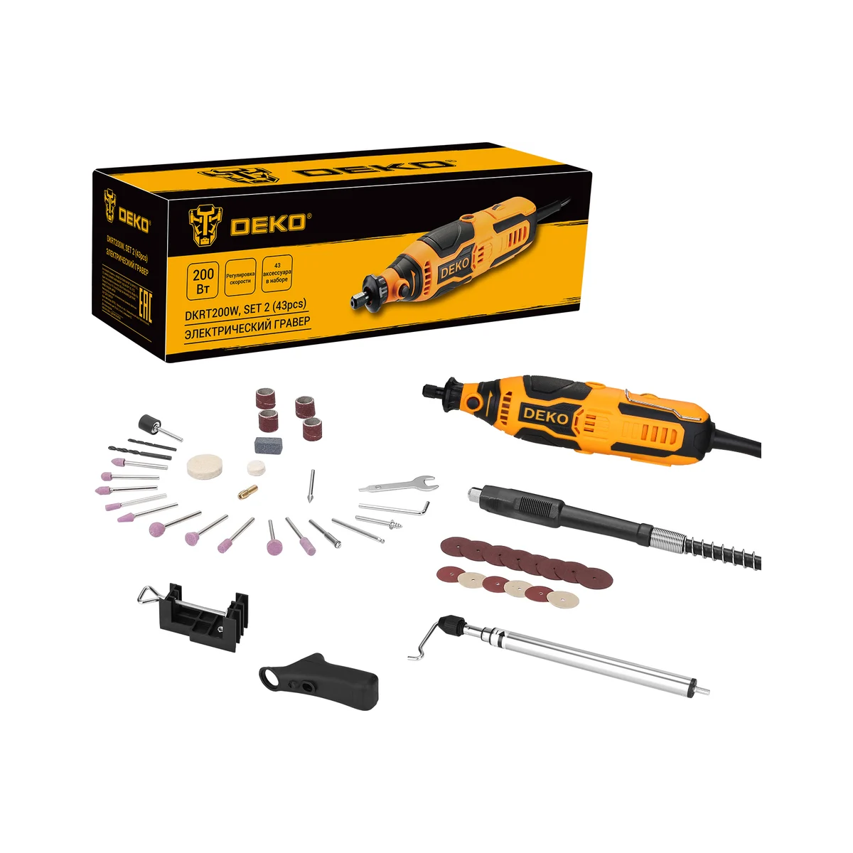 Электрический гравер DEKO DKRT200W с набором из 43 аксессуаров — это универсальный инструмент для бытового использования, который идеально подходит для выполнения широкого спектра задач.