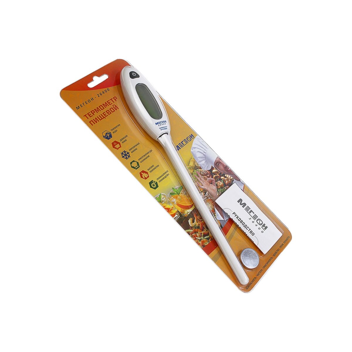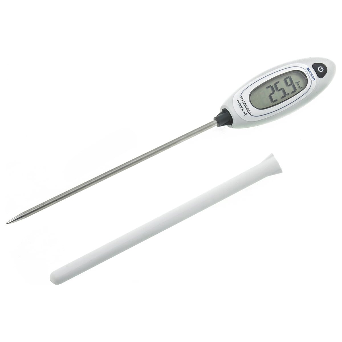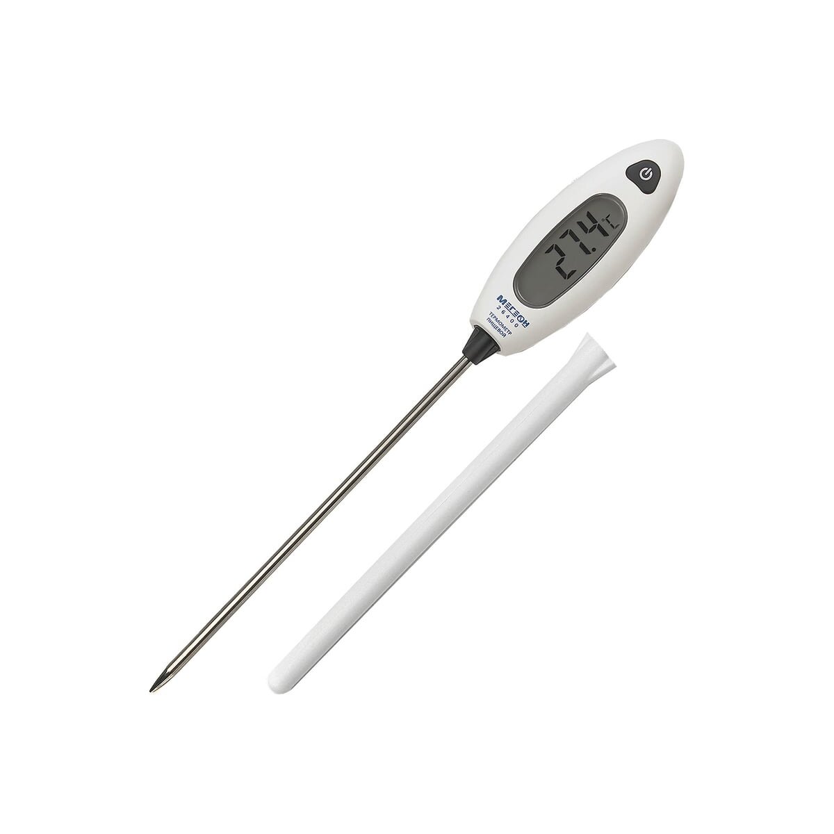 Контактный термометр (тип - игла), в основном используется для измерения температуры пищевых продуктов. Зонд термометра выполнен из нержавеющей стали высшего качества. При помощи термометра с зондом можно точно отслеживать температуру приготовления пищи (в духовке, на гриле, в воде). Термометр также применяют, в различных сферах деятельности (работа с отопительным и холодильным оборудованием, при обработке пластиков и резины). Может также приняться для работы с растениями - поможет узнать температуру у корневища. Простота эксплуатации достигается простому управлению одной кнопкой на панели. Помимо измерения текущих значений температуры предусмотрено удержание максимальных и минимальных показателей нагрева или охлаждения. Благодаря функции автоматического выключения увеличен срок службы батареи.