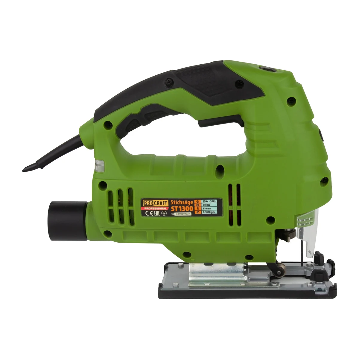 Технические характеристики PROCRAFT ST1300Типс маятниковым ходомМощность1300 ВтМаятниковый ходдаФорма ручкискобовиднаяФункция сдува опилокдаНаличие лазерадаНаличие подсветкиестьНаличие быстр. зам. пилкиестьНаличие плавного пускадаНаличие защитного экранаестьЛитая подошвадаМах толщина пропила (дерево)110 ммМах толщина пропила (металла)10 ммХод пилки28 ммРегулировка наклона подошвы без инструментадаПоддержание постоянных оборотов под нагрузкойдаЛегкий доступ к щеткаместьВозможность подключения к пылесосуестьДлина кабеля3 мПилки в комплекте1Вес нетто2.4 кгЧисло ходов500-3000 ход/мин