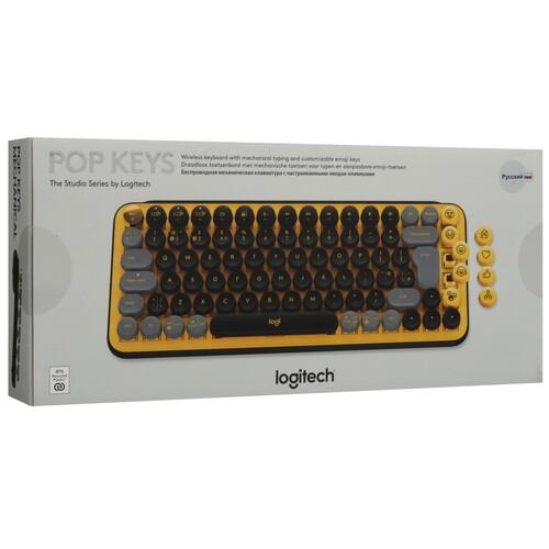 Клавиатура беспроводная Logitech POP Keys [920-010716] представлена в пластиковом корпусе с комбинацией желтого и черного цветов. Тактильные механические переключатели Logitech GX Brown обеспечивают плавное нажатие и характерный щелчок. В модели реализованы клавиши переключения эмодзи и вызова меню.