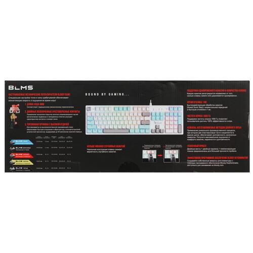 Клавиатура проводная A4Tech Bloody S510N с механическими линейными переключателями BLMS обеспечивает комфортный и увлекательный гейминг. Она отличается полноразмерной раскладкой с 104 клавишами. Благодаря технологии настройки точки и силы срабатывания достигаются быстрая отзывчивость на каждое нажатие. Данная модель оформлена в белом цвете и украшена подсветкой символов neon. Технология NKRO снижает вероятность ошибок при одновременном нажатии нескольких клавиш. Подключение A4Tech Bloody S510N осуществляется посредством проводного кабеля USB.