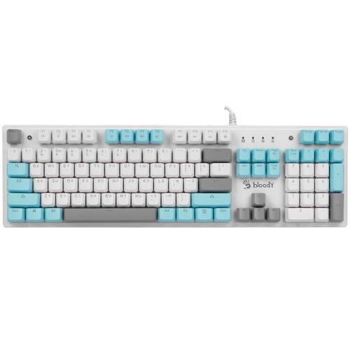 Полноразмерная проводная клавиатура A4Tech Bloody S515R имеет 104 клавиши с отдельным блоком цифр и линейкой Fn с различными функциями. Все клавиши разделены на 3 цвета по функциям: буквы и цифры белые, стрелки, пробел и некоторые другие – серые, а колонка Fn – голубая. Для удобства работы в темноте или при слабом искусственном освещении можно включить трехцветную RBG-подсветку.