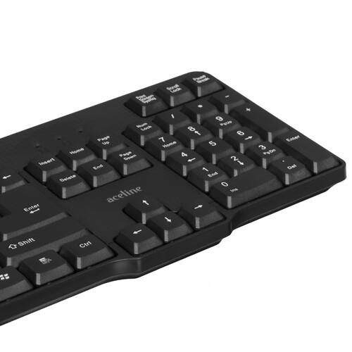 Aceline K-504BU оборудована защитой от прямого попадания воды и брызг. Поэтому пролитый чай не повредит клавиатуру. Подключение к компьютеру происходит через кабель USB с разъемом Type-A. Устройство можно подключить только к 1 устройству.