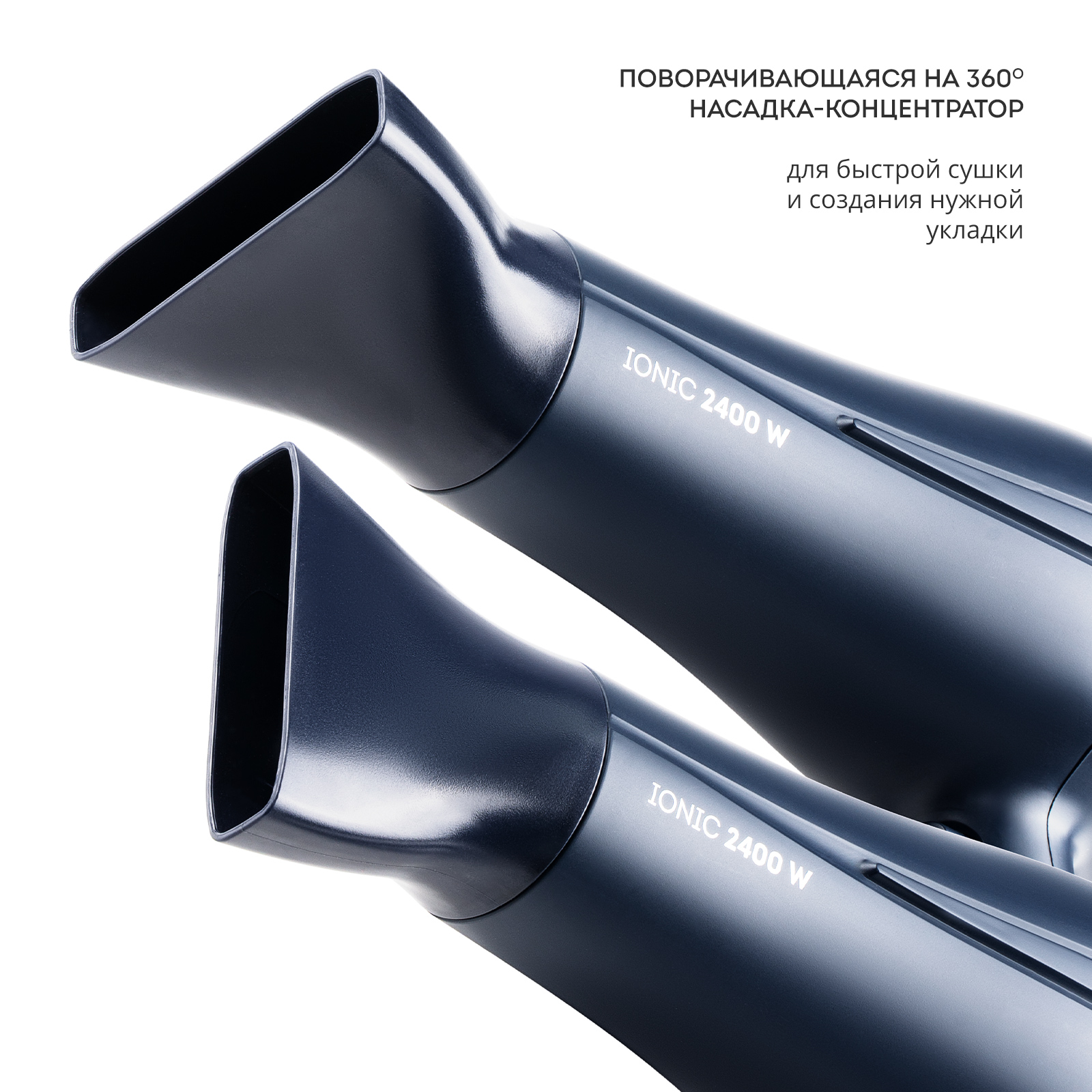 Насадка-концентратор направляет поток воздуха на прядь волос, позволяя ей высохнуть намного быстрее, что значительно ускоряет время укладки.