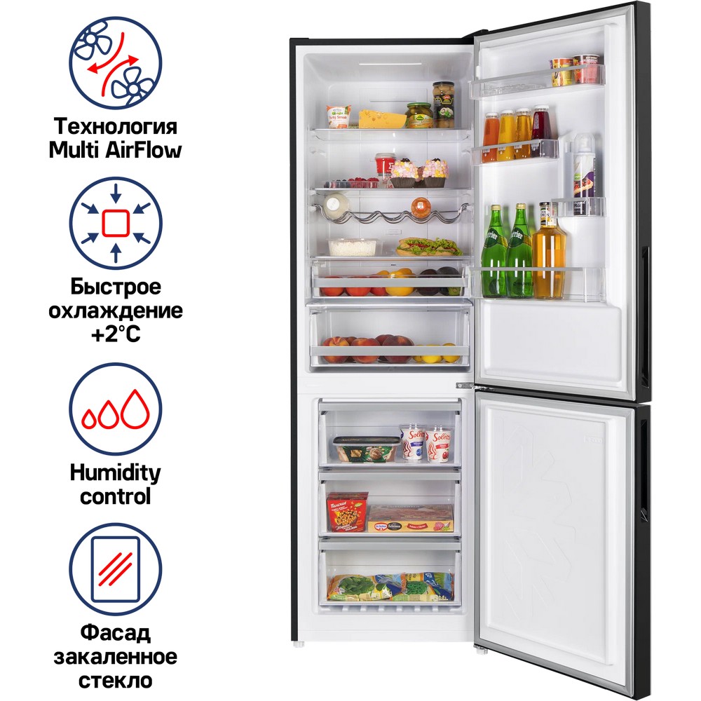 индикация температуры, система контроля влажности, Full No Frost, Антибактериальное покрытие камеры, Светодиодная подсветка, Скрытые ручки, Суперзаморозка