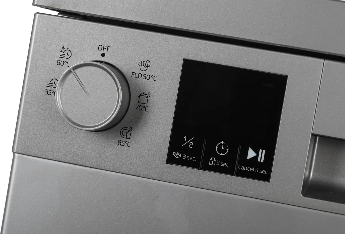 Компактная серебристая посудомоечная машина с поворотным переключателем. Идеальное решение для современных кухонь, где важно сочетание стильного дизайна и функциональности.