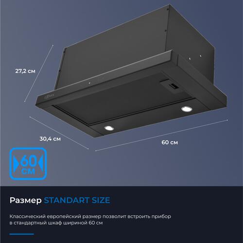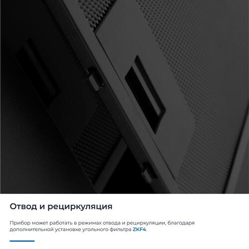 Мощный мотор с лёгкостью очистит воздух в помещении до 32 м². Расположенная фронтально сенсорная панель управления исключает дискомфорт в использовании и реагирует на нажатия с первого раза. Пульт дистанционного управления увеличивает комфорт, позволяя использовать весь функционал прибора на расстоянии. Таймер позволит отключиться прибору самостоятельно через 15 минут. Активировав функцию автоматического проветривания, вытяжка будет автоматически включаться каждый час на 10 минут, чтобы сохранить свежесть воздуха в помещении. Две мощные и передовые светодиодные лампы по 1 Вт позволят полноценно осветить рабочую поверхность. Переходник в комплекте позволит подключить воздуховод обоих размеров. Прибор может работать в режимах отвода и рециркуляции, благодаря дополнительной установке угольного фильтра ZKF4.