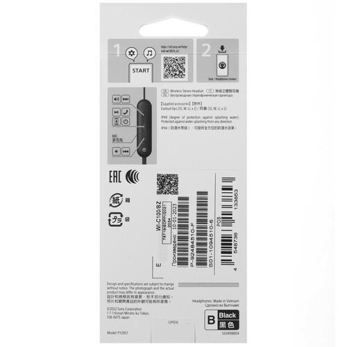 Bluetooth-гарнитура Sony WI-C100 черного цвета фиксируется на гибкий шейный ободок. Это наушники-вкладыши со встроенным аккумулятором. На одном заряде они работают до 25 часов. 10-минутная быстрая зарядка продлевает работу наушников на 1 час. Стандарт IPX4 определяет защиту корпуса от пота и брызг.