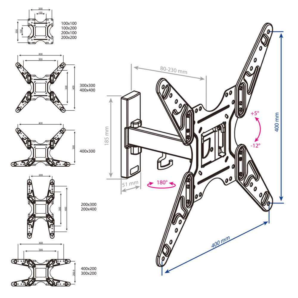 Крепежные отверстия (VESA): 100х100, 100х200, 200х100, 200х200, 300х200, 200х300, 300х300, 200х400, 400х200, 400х300, 400х400