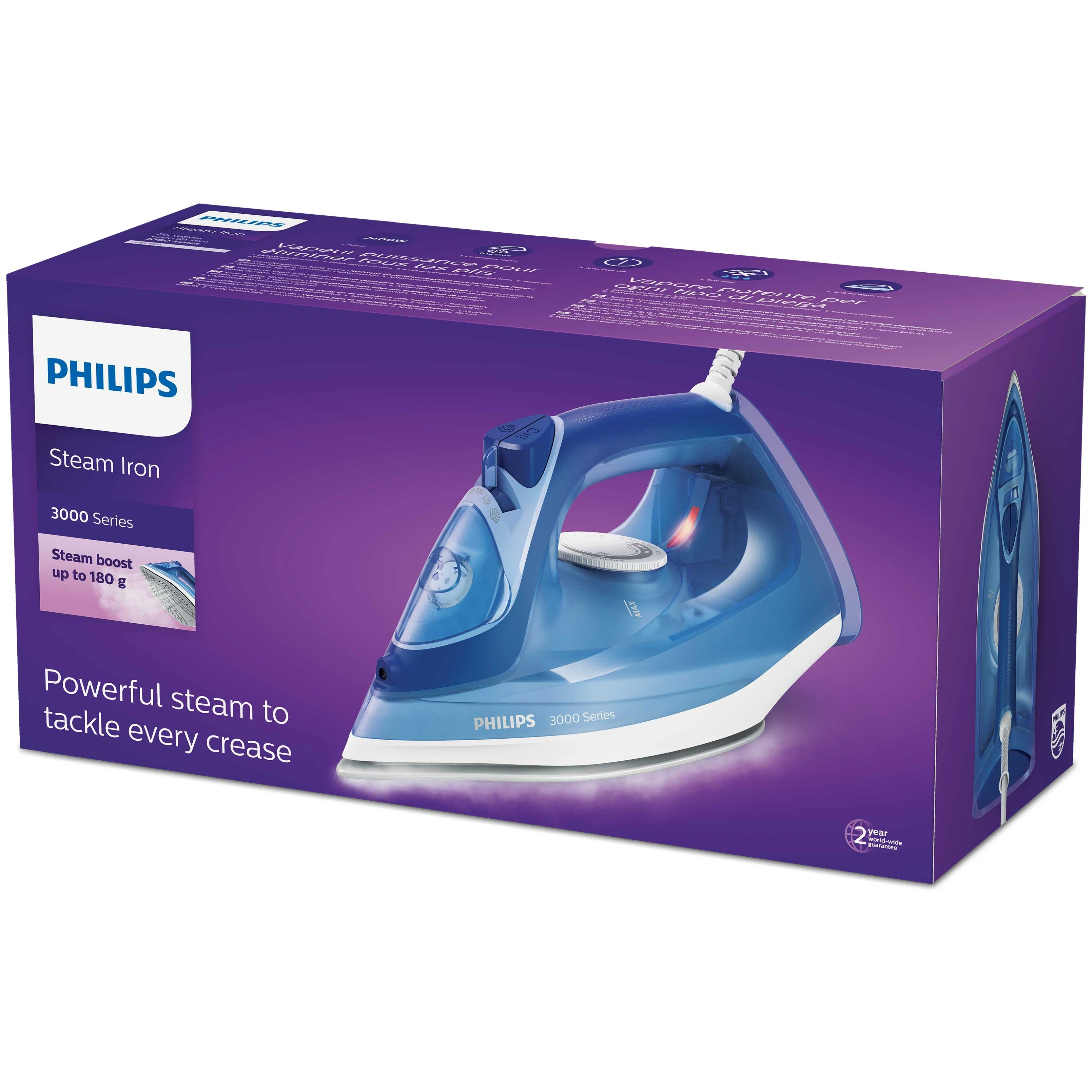 Паровой утюг серии 3000 позволяет легко разглаживать даже жесткие складки благодаря мощной подаче пара. Керамическая подошва обеспечивает гладкое скольжение, а резервуара для воды 300 мл хватит для глажения небольшой стопки вещей даже без пополнения.