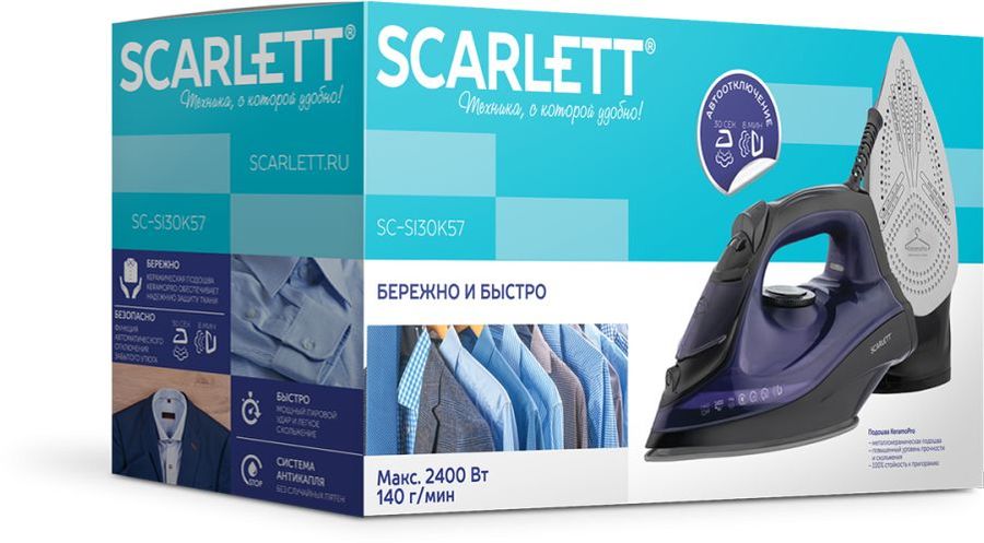 Описание: Утюг Scarlett SC-SI30K57 с пластиковым корпусом фиолетово-чёрного цвета снабжен идеально гладкой подошвой с керамическим покрытием KeramoPro, которая обеспечивает отличное скольжение и бережное отношение ко всем видам тканей.
