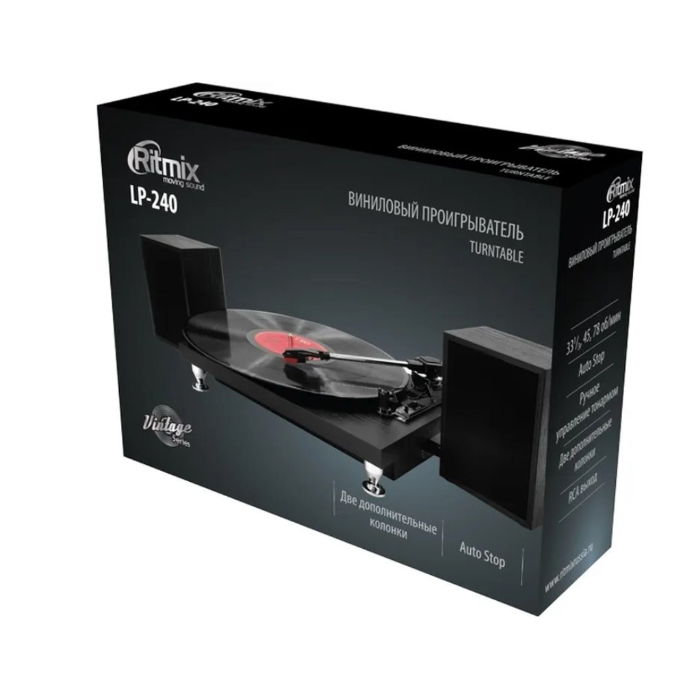 Проигрыватель виниловых дисков Ritmix LP-240 обладает полной комплектацией для комфортного использования и стильным дизайном. Он поддерживает три скорости воспроизведения пластинок: 33 1/3, 45, 78 оборотов в минуту и функцию Auto Stop. Ручки настройки для изменения громкости и переключения режимов и ручное управление тонармом значительно упрощают настройку проигрывателя. В комплекте идут две полноразмерные колонки.