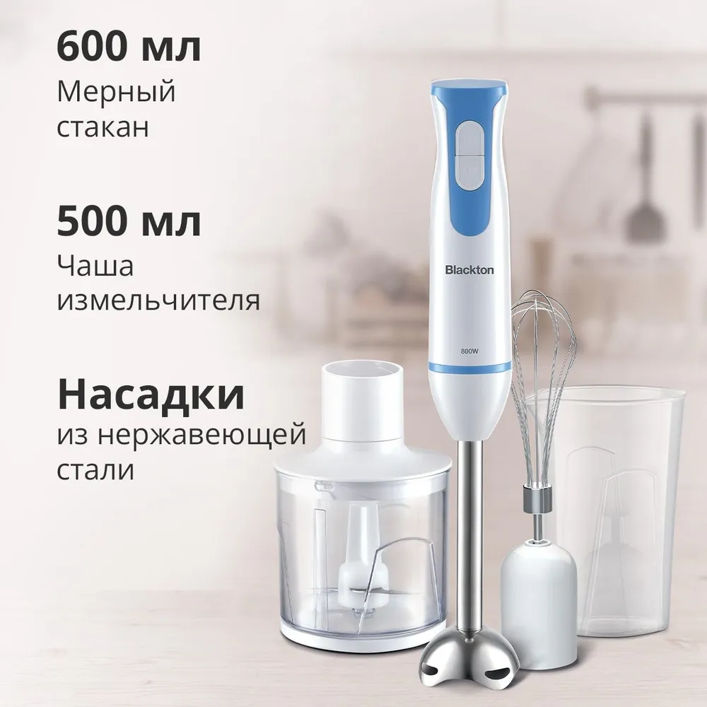 Блендер Blackton HB401S - это устройство 3в1, совмещающее в себе функции погружного блендера, измельчителя и миксера. Погружной блендер - это отличный помощник в готовке молочных коктейлей, жидкого теста для блинов и оладий, детского питания, ягодного сорбета, домашнего кетчупа и майонеза. Так же блендер поможет избавиться от неразбитых кусочков моркови или брокколи в крем-супе. Блендер Blackton может работать как миксер: установите насадку-венчик, и вы сможете взбить яйца для омлета или бисквита, сливки, легкий творожный крем или мусс на десерт. С помощью ножа из нержавеющей стали блендер с насадкой измельчитель поможет вам измельчить овощи, фрукты и даже орехи.