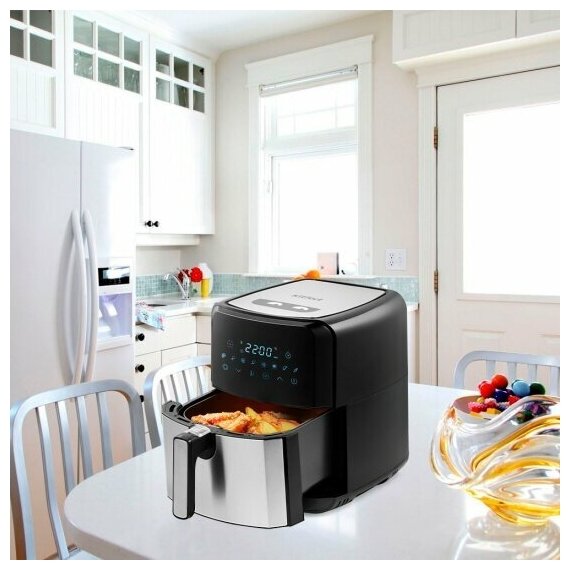 Стильный и компактный аэрогриль Kitfort КТ-2239 может использоваться как аэрогриль, а также как аэрофритюрница, духовка и сушилка и позволяет готовить большинство продуктов с минимальным количеством масла или вовсе без его добавления. Продукты готовятся в специальной корзине, которая вставлена в поддон. Благодаря системе циркуляции горячего воздуха, продукты обжариваются равномерно со всех сторон, получаясь нежными внутри и с хрустящей корочкой снаружи.