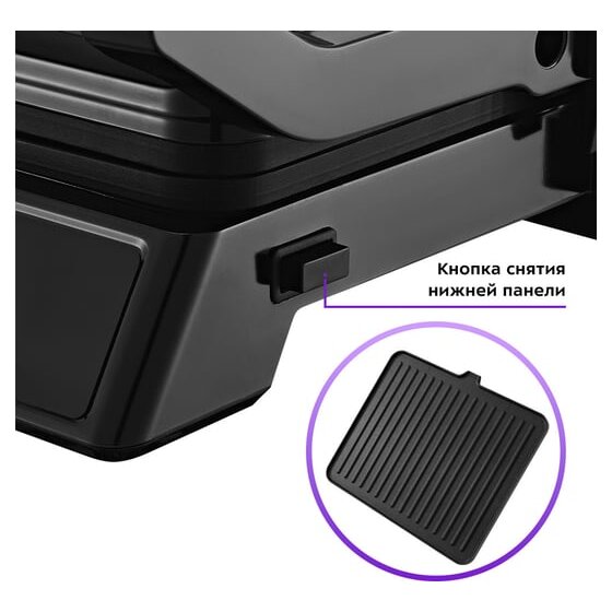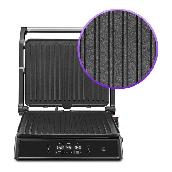 На панели нанесено антипригарное покрытие, что позволяет готовить с минимальным количеством масла или без него. Такое покрытие также облегчает процесс чистки панелей. Панели у этого гриля съемные.