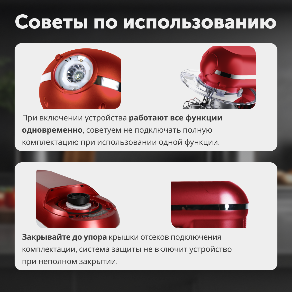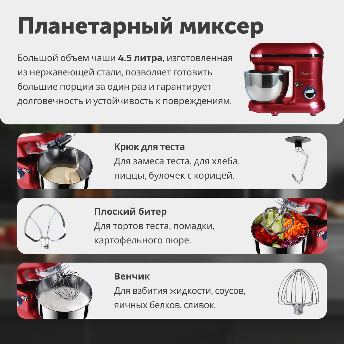 • Функции: мясорубка, блендер, овощерезка (докупается отдельно), планетарный миксер;