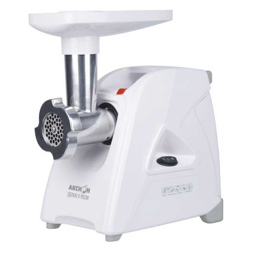 мощность 1500Вт, производительность 1.7кг/мин; количество скоростей — 1; реверс; защита от перегрузки; насадка для колбас; материал лотка — пластик; цвет — белый