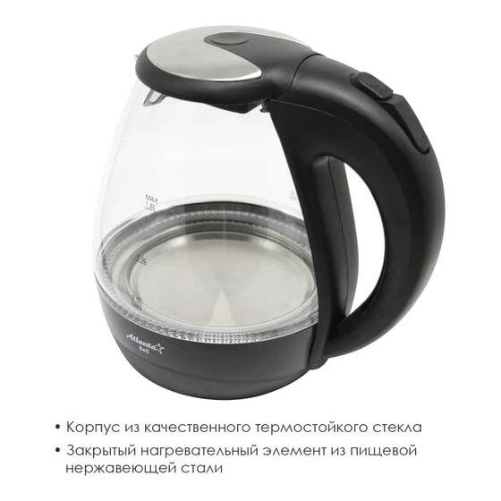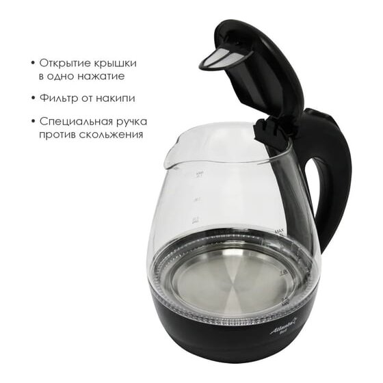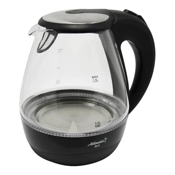 Стеклянный электрический чайник Atlanta ATH-2460 black предназначен для использования в офисе или дома.