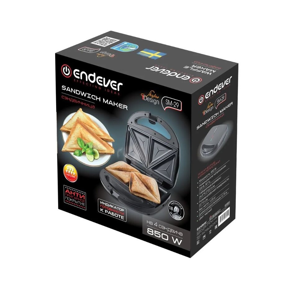 Благодаря электрической сэндвичнице Endever Skyline SM-29, Вы сможете приготовить настоящие английские сэндвичи со всевозможными начинками. Во время приготовления они разделяются на красивые треугольные кусочки. А высокая мощность 850 Вт позволит приготовить сэндвичи еще быстрее.